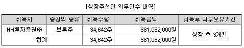 상장주선인의 의무인수 주식은 주관사가 의무로 인수하는 주식을 말합니다. 주관사인 NH투자증권에서 주식을 34,624주를 가져갔으며 이는 전체의 0.67%를 차지 합니다. 3개월 뒤에는 물량이 시장에 나올 수 있으며 이로 인해 시장이 하락할 수 있습니다.