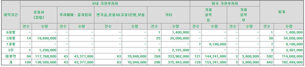 | 2,000,000주 | 500,000주(25%) | 대신증권 | 2,000원(일반) | 없음 |