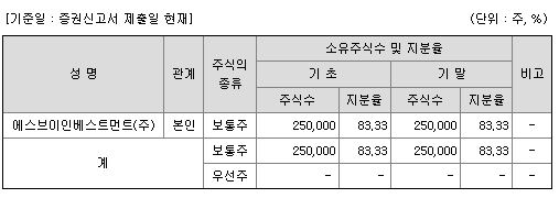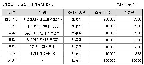에스브이인베스트먼트가 최대주주입니다. 83.33%입니다. 그 외에는 에스브이 파트너스, 라피스 인베스트먼트, 씨스퀘어 자산운용, 지니자산운용, 미래에셋증권이 3.33%씩의 지분을 가져갑니다. sv인베스트먼트는 한때 빅히트 투자 지분이 있는 걸로 알려졌던 기억이 있습니다. (현 하이브) IT와 바이오 분야 등 고루 투자하고 있는 회사입니다.