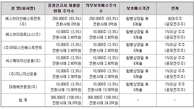 스팩은 지금 주식을 발행하기 때문에 상장일 유통물량이 많습니다. 총 발행 개수 대비 93.94%가 상장일 유통물량에 해당됩니다. 현재 대주주로 있는 수량의 물량만 락업되며 합병 상장일 이후 6개월입니다. 굉장히 짧네요?