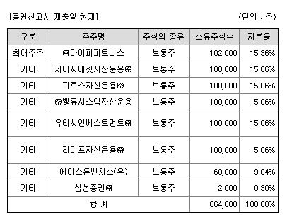 최대주주 발기인은 아이피파트너스로 되어있는데요. 지분율을 보면 기타로 참여하는 회사들과 차이가 크지 않습니다. 지분율이 0.30% 더 높고 2,000주를 더 가지고 있습니다.