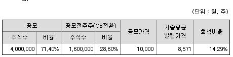 우선 공모가를 살펴보자면 10,000원입니다. 기존에 발행한 주주들의 주식과 비교하여 희석비율이 14.29%입니다. 기존 주주들이 공모주 가격인 10,000원보다 싸게 공모전 주주와 전환사채를 사들이기 때문에 전체 주식이 상장하면 가중평균 발행가는 8571원이 됩니다.