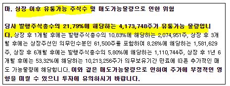 상장일 유통가능 물량을 살펴봅니다. 총 유통 물량은 21.79%이며, 이중에 공모주 물량은 10.70% 입니다. 이외에는 기존 투자자들의 물량이 11.09%시장에 나오게 됩니다.