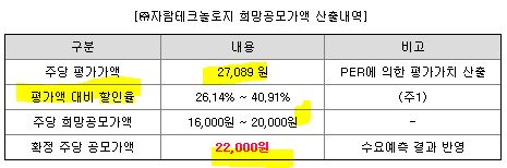 공모가는 희망 밴드가 20,000원이 상단이었는데 22000원으로 결정하셨구요.물 들어올 때 노 저으시나봅니다. 할인율은 18.78%로 확 떨어졌습니다.