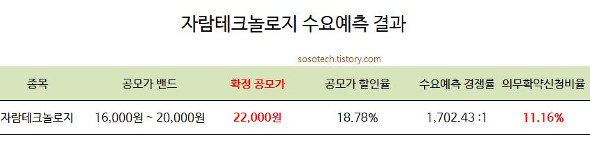 자람테크놀로지 수요예측 결과 입니다. 경쟁률은 1702대 1로 높게 나왔습니다. 이렇게 높은 수요가 있는데 왜 2번이나 철회를 해야했을까요? 지금은 그냥 시장 분위기 보고 들어가는 게 아닐까 싶기도 합니다.