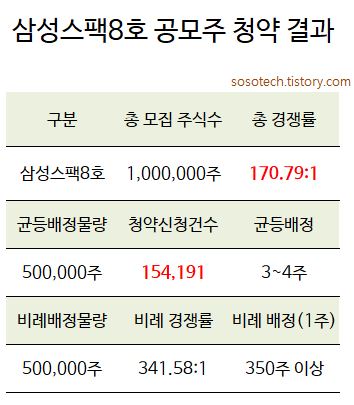 삼성스팩은 일반청약자 수량을 넉넉하게 50만주를 모집했으나 총 신청건수가 청약 신청 건수에 미치지 못합니다. 그러니까 다른 기업에 비해 작고 초라한 170대 1의 경쟁률을 가져왔겠죠 ? 균등은 3~4주가 될거라고 하니 좋은소식이 아닐 수 없습니다. 수수료가 2000원이기 때문에 4주를 받는다고 하면 1건당 2500원 수준. 비례하시는 분들은 이야기가 달라지겠고요.