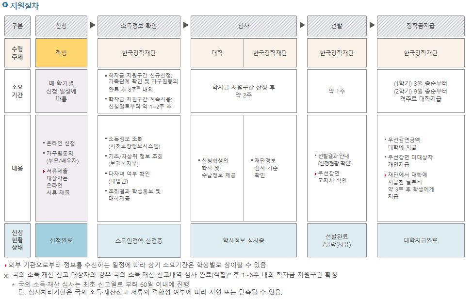 지원 절차는 소득정보 확인 . 심사>선발 > 장학금 지급으로 이어지며 1학기는 3월 중순부터, 2학기는 9월 중순부터 대학으로 지급됩니다. 우선감면 금액은 대학에 지급되며 우선감면 미대상자는 개인으로 지급됩니다. 재단에서 대학에 지급한 날부터 약 3주후부터 학생에게 지급됩니다.