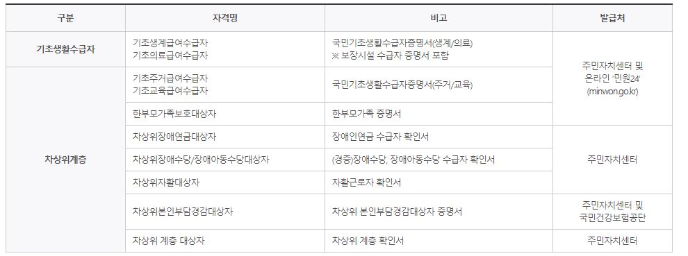 기초생활수급자, 차상위 계층, 미혼,기혼 여부 등 서류제출이 필요한 분들이 따로 있는데요. 홈페이지에 확인하면 상세한 내역을 확인 하실 수 있습니다.