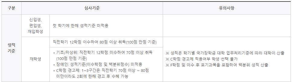 재학생의 경우 직전학기 성적이 12학점을 이수하며 100점만점 기준의 80점 이상을 취득해야합니다.