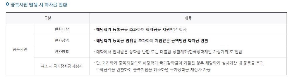 학자금 대출과 중복지원시에는 등록금을 초과하여 지원 받은 금액만큼 학자금을 반환해야합니다. 거절된 경우에는 초과된 수혜금액을 반환 후에 재심사를 통해서 재심사가 가능합니다.