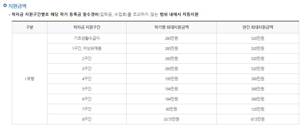 지원금액은 소득별로 구간을 나누어서 학기별 최대 재원금액이 나누어져 있습니다. 1차 ,2차로 총 2번 적용되며 기초 생활수급자와 차상위 계층, 1구간~3구간은 최대 260만원까지 지원이 가능합니다.